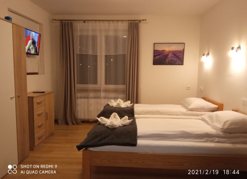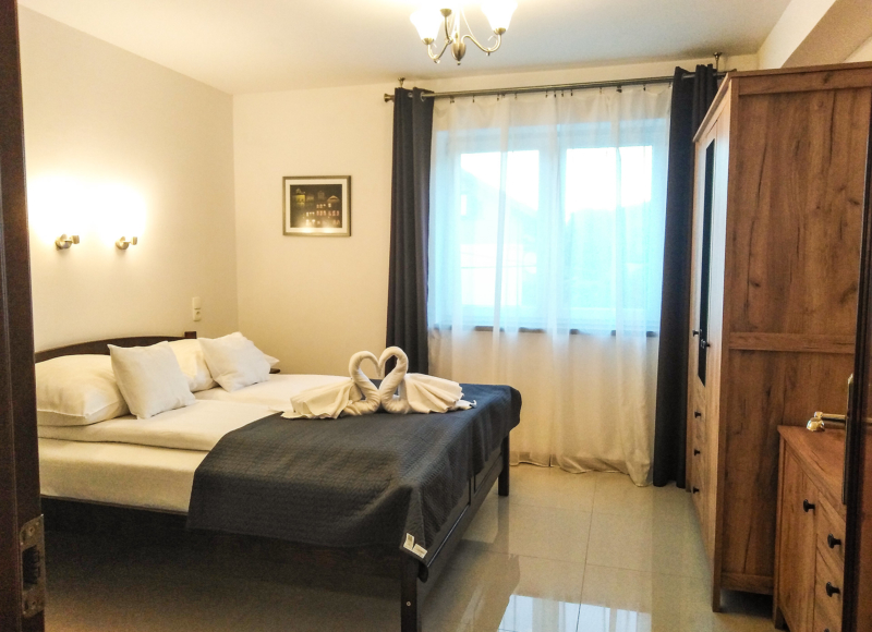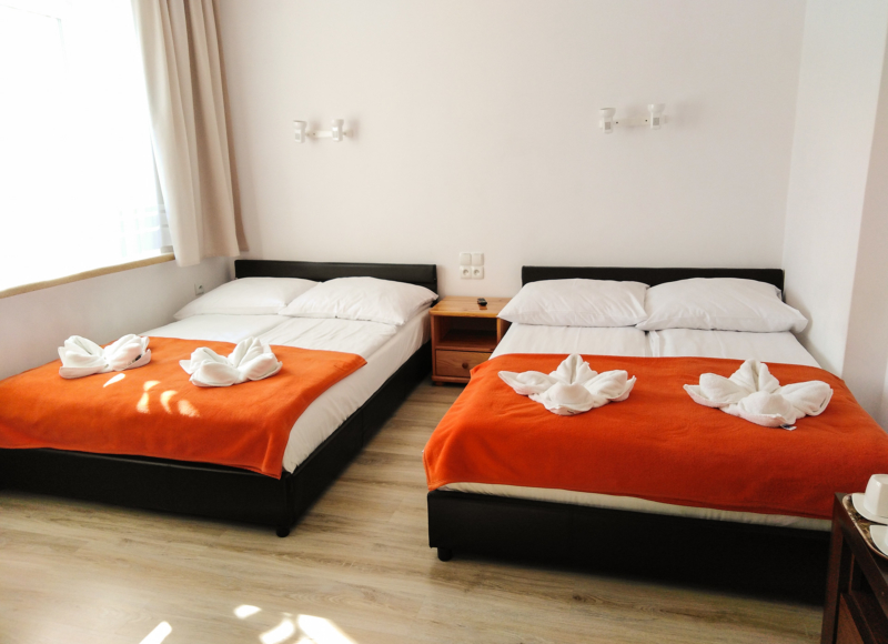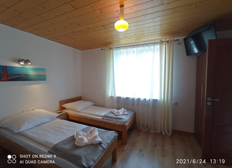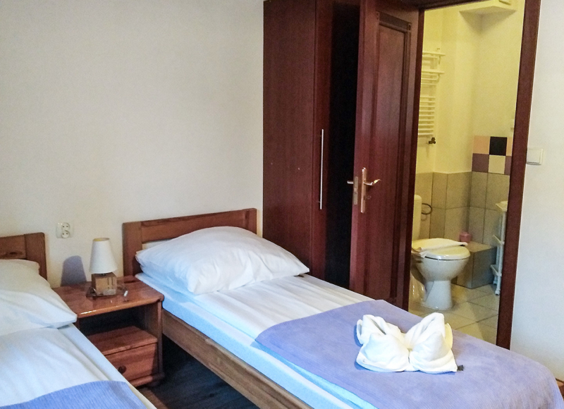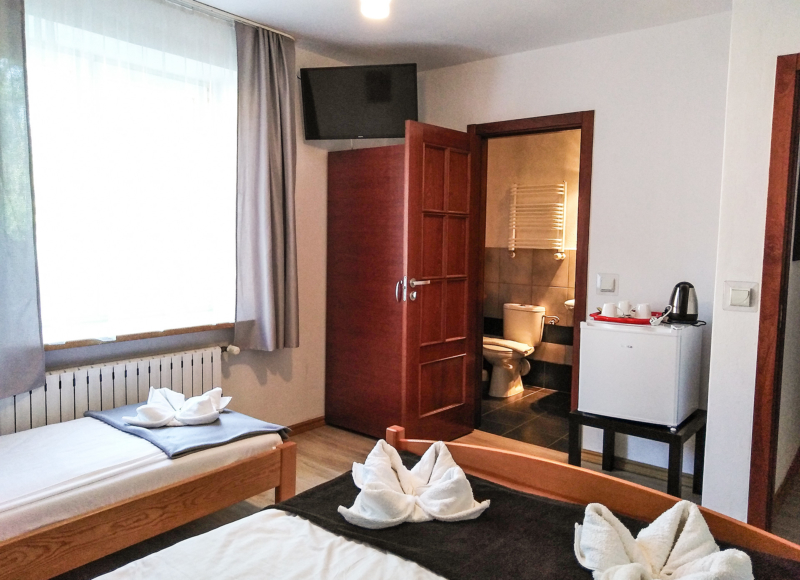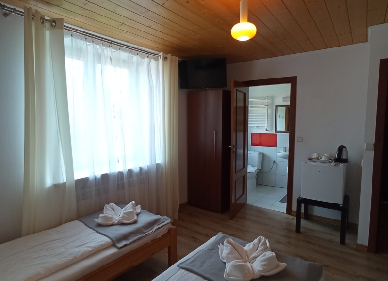 4 osobowy pokój z łazienką wygodny dla rodzin z 2 dzieci . Na powierzchni 19 m2 znajdują się dwa łóżka podwójne ( małżeńskie ) oraz szafa, stolik i szafka nocna . Wyposażenie pokoju ; płaski telewizor ,mała lodówka ,czajnik do gotowania wody , filiżanki talerzyki do herbaty lub kawy, .W łazience znajduje się prysznic ,umywalka, wc ,suszarka do włosów, ręczniki , mydło .
