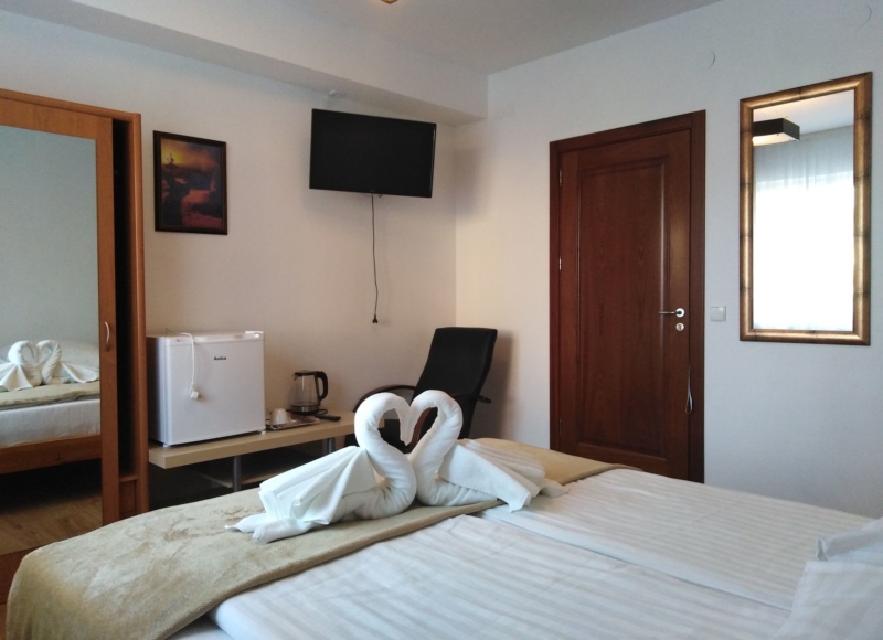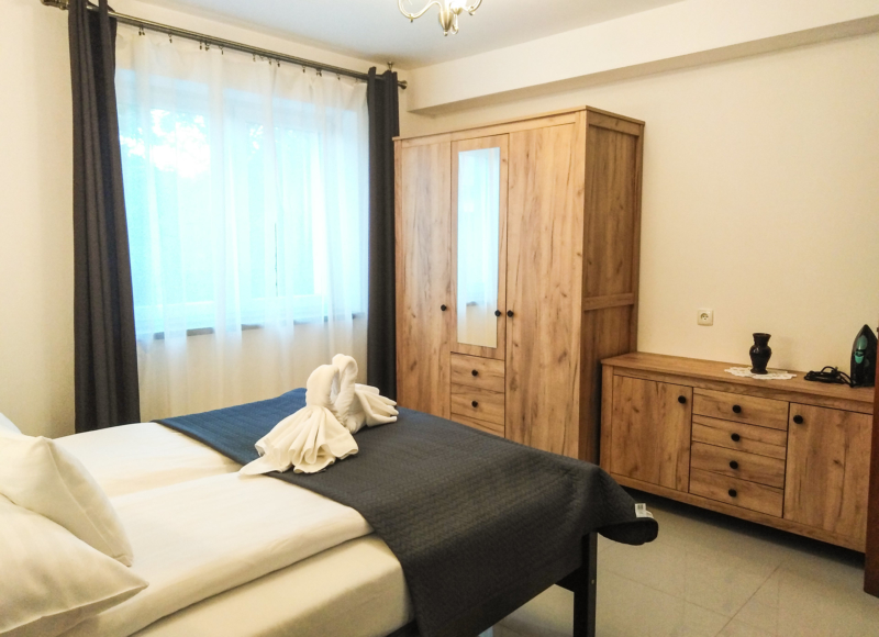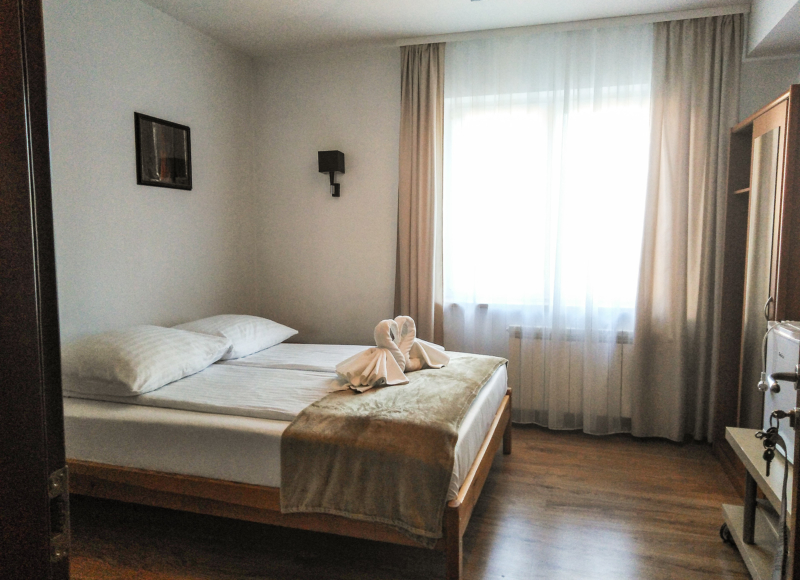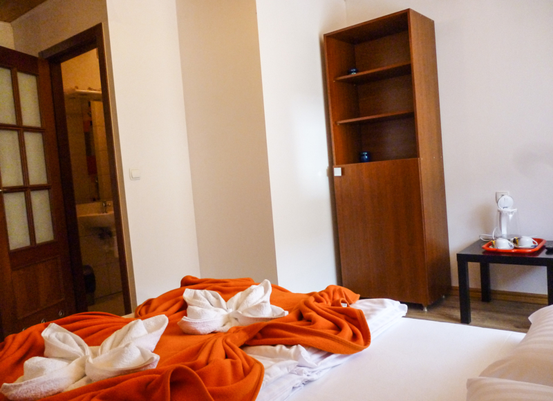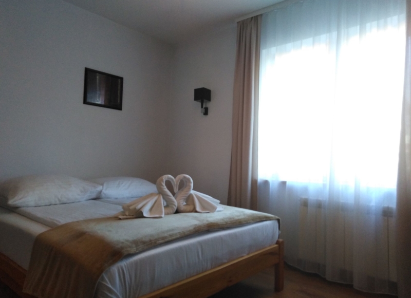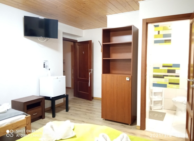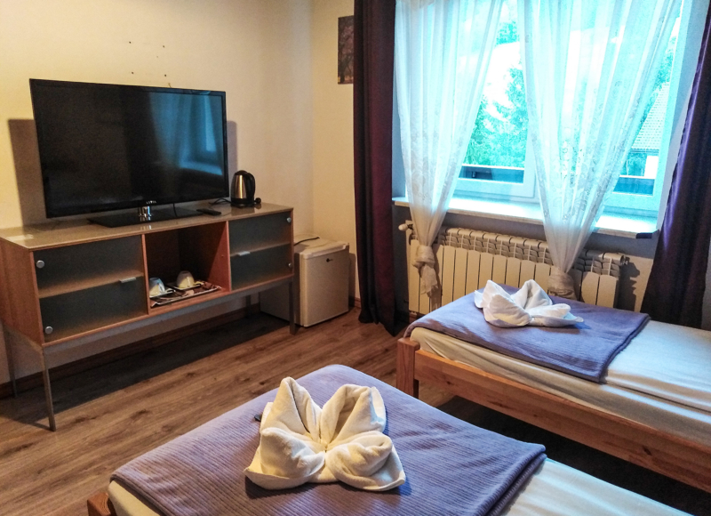 4 osobowy pokój z łazienką wygodny dla rodzin z 2 dzieci . Na powierzchni 19 m2 znajdują się dwa łóżka podwójne ( małżeńskie ) oraz szafa, stolik i szafka nocna . Wyposażenie pokoju ; płaski telewizor ,mała lodówka ,czajnik do gotowania wody , filiżanki talerzyki do herbaty lub kawy, .W łazience znajduje się prysznic ,umywalka, wc ,suszarka do włosów, ręczniki , mydło .