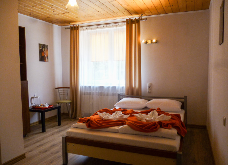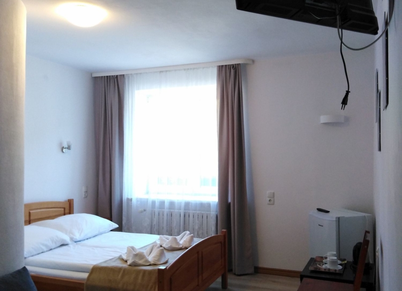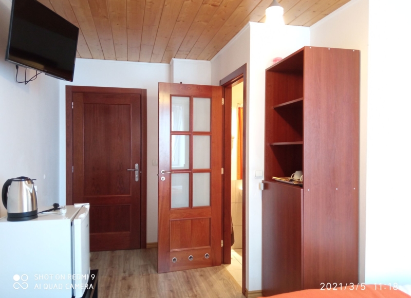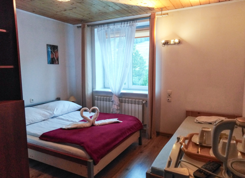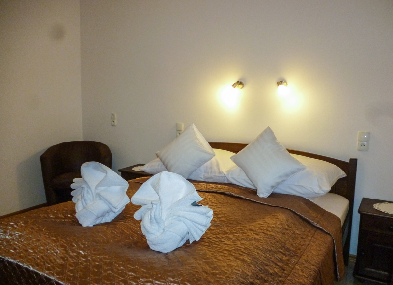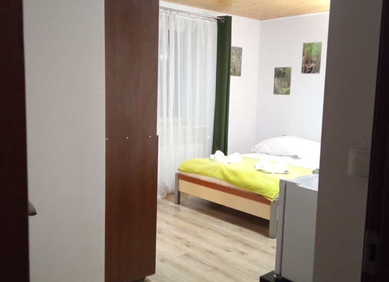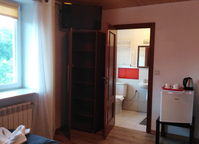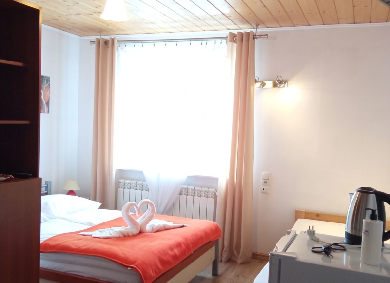 2 osobowy pokój z łazienką wygodny dla pary . Na powierzchni 19 m2 znajduje się duże łóżko podwójne ( małżeńskie ) oraz szafa, stolik i szafka nocna . Wyposażenie pokoju ; płaski telewizor ,mała lodówka ,czajnik do gotowania wody , filiżanki talerzyki do herbaty lub kawy, .W łazience znajduje się prysznic ,umywalka, wc ,suszarka do włosów, ręczniki , mydło .