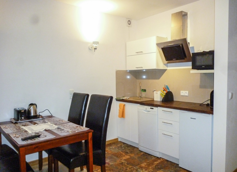 Do dyspozycji naszych gości jest wspólna dla 10 pokoi kuchnia wyposażona w dwie jednopalnikowe płyty indukcyjne do gotowania , mikrofala ,opiekacz, toster , prosty expres do kawy , oraz inne akcesoria potrzebne do gotowania czy smażenia . Razem z kuchnią w jednym pomieszczeniu jest stołówka ze stołami do spożycia przygotowanych posiłków. Dla każdego pokoju jest bezpłatnie miejsce parkingowe . W budynku znajduje się narciarnia z suszarnią na buty w zimie dla narciarzy a w lecie jest to bezpieczne miejsce na rowery . Dodatkowa zaletą pokoju jest ładny widok na góry.