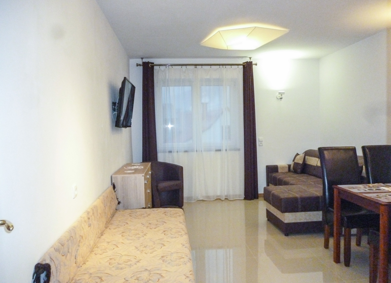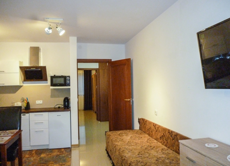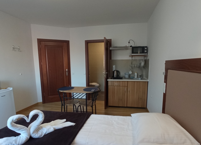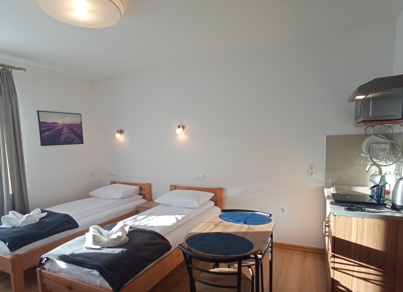 2 osobowy pokój typu studio z łazienką i aneksem kuchennym . Na powierzchni 22 m2 znajdują się dwa łóżka pojedyncze oraz szafa, komoda, stolik z dwoma krzesłami i szafka nocna . Wyposażenie pokoju ; aneks kuchenny,płyta grzewcza ,garnki ,talerze ,sztućce , lodówka ,czajnik do gotowania wody , ekspres do kawy ,toster, mikrofala , filiżanki talerzyki do herbaty lub kawy. W pokoju jest stół z 2 krzesłami oraz płaski telewizor. W łazience znajduje się prysznic ,umywalka, wc ,suszarka do włosów, ręczniki , mydło .