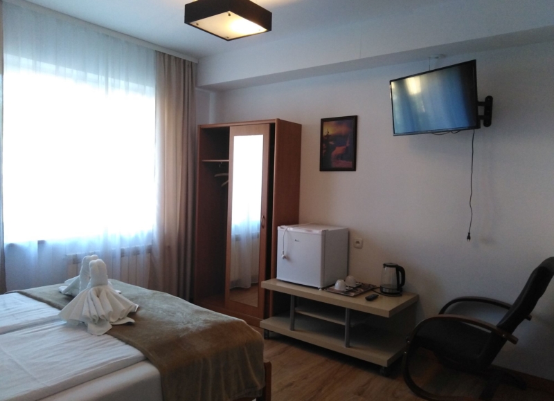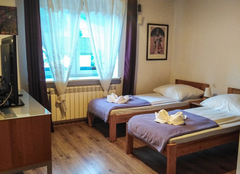 2 osobowy pokój z łazienką wygodny dla 2 osób znajomych . Na powierzchni 17 m2 znajdują się 2 łóżka pojedyncze , szafa, stolik i szafka nocna . Wyposażenie pokoju ; płaski telewizor ,mała lodówka ,czajnik do gotowania wody , filiżanki talerzyki do herbaty lub kawy, .W łazience znajduje się prysznic ,umywalka, wc ,suszarka do włosów, ręczniki , mydło .