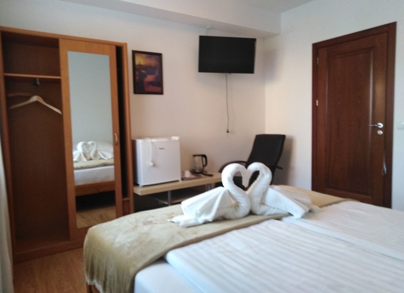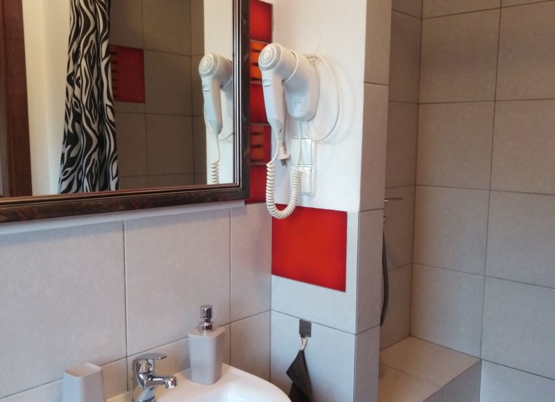 2 osobowy pokój z łazienką wygodny dla pary . Na powierzchni 17 m2 znajduje się łóżko podwójne ( małżeńskie ) oraz szafa, stolik i szafka nocna . Wyposażenie pokoju ; płaski telewizor ,mała lodówka ,czajnik do gotowania wody , filiżanki talerzyki do herbaty lub kawy, .W łazience znajduje się prysznic ,umywalka, wc ,suszarka do włosów, ręczniki , mydło .