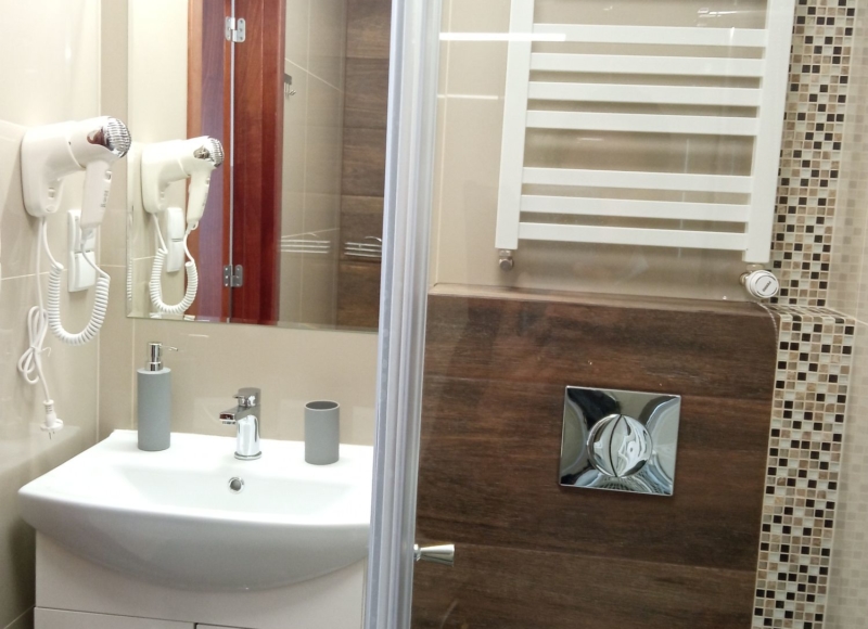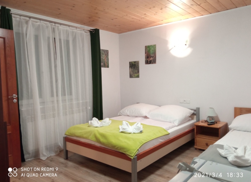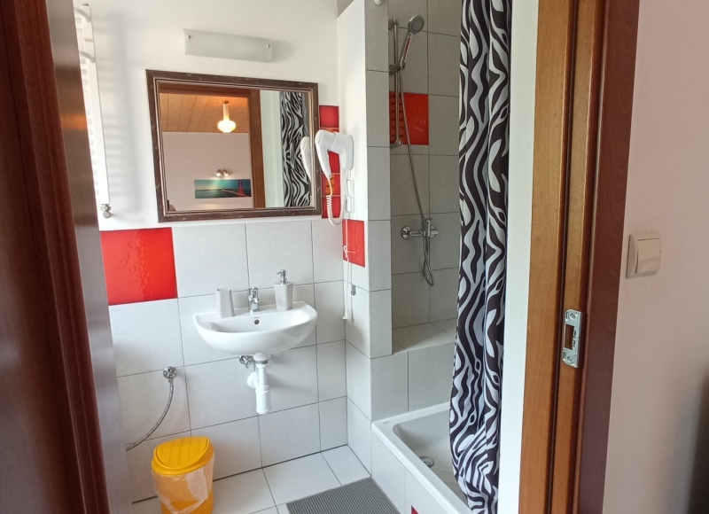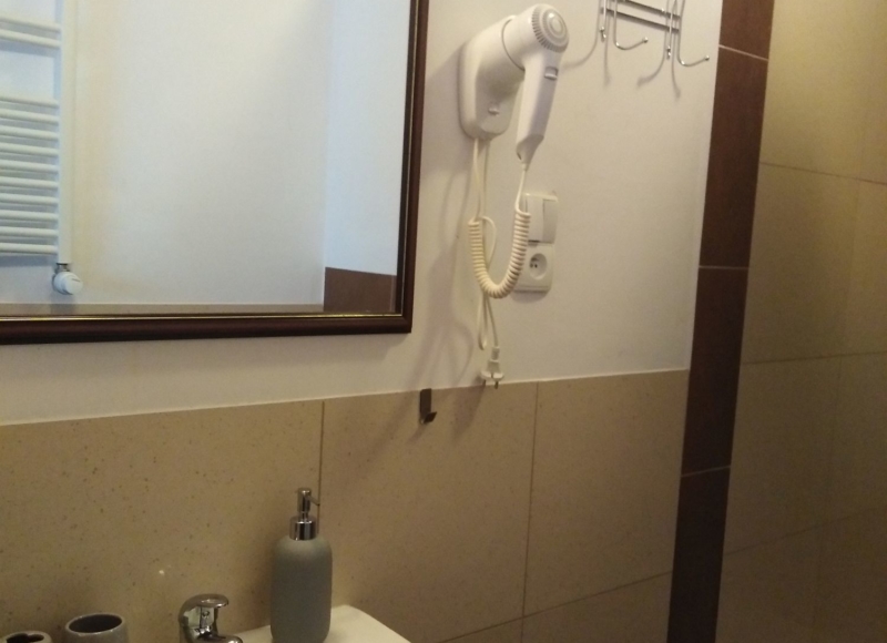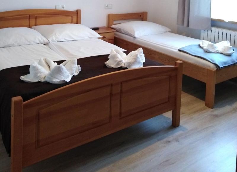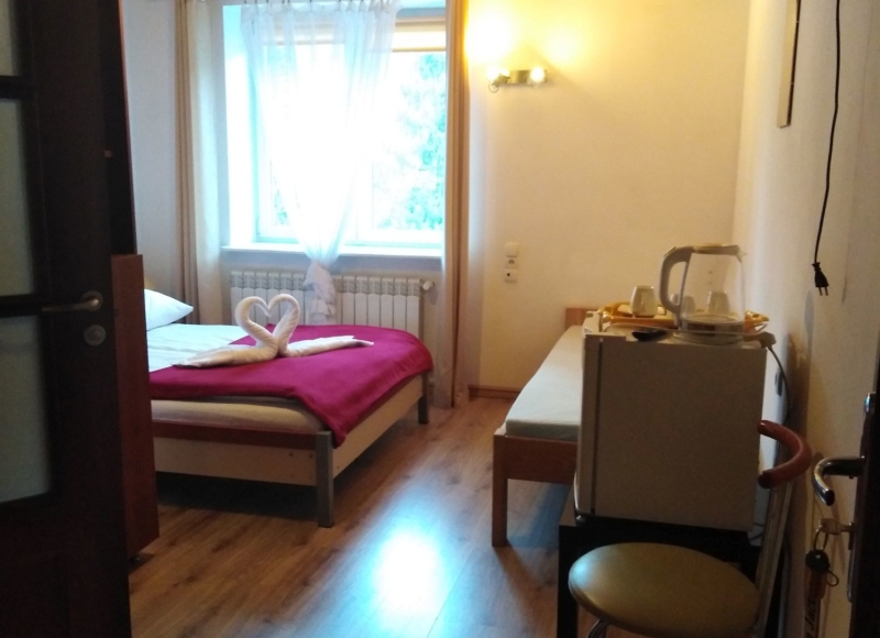 3 osobowy pokój z łazienką wygodny dla pary z dzieckiem lub osoby towarzyszącej . Na powierzchni 16 m2 znajduje się łóżko podwójne ( małżeńskie ) oraz łóżko pojedyncze , szafa, i szafka nocna . Wyposażenie pokoju ; płaski telewizor ,mała lodówka ,czajnik do gotowania wody , filiżanki talerzyki do herbaty lub kawy, .W łazience znajduje się prysznic ,umywalka, wc ,suszarka do włosów, ręczniki , mydło .