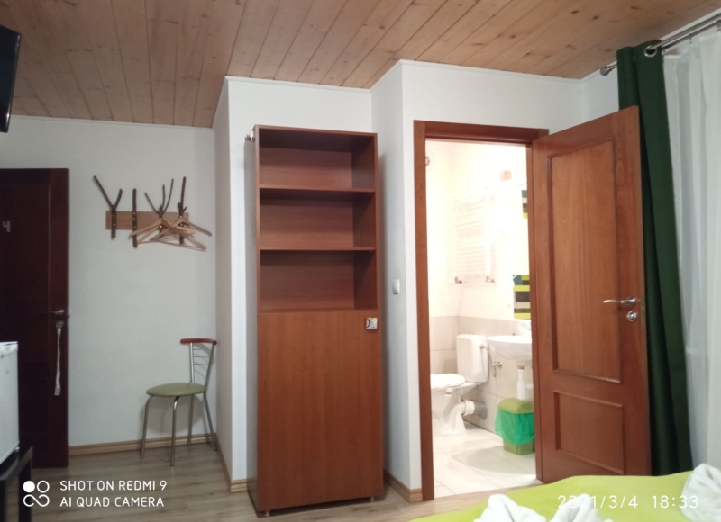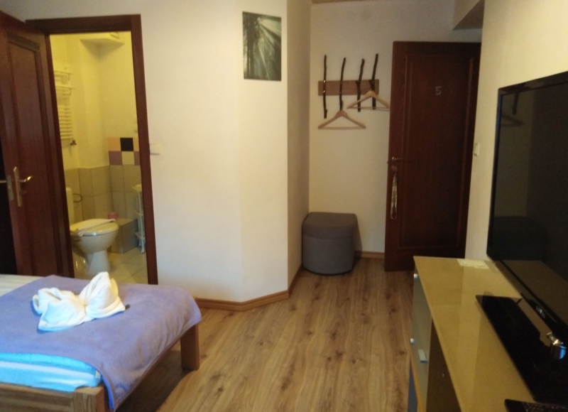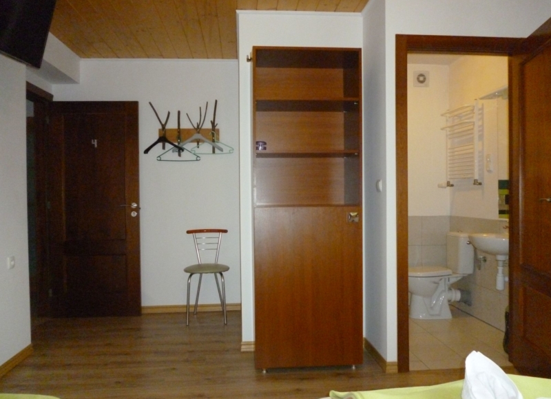 Pokój zlokalizowany jest na 3-cim piętrze . Ponadto do dyspozycji naszych gości jest w obiekcie wspólna dla 8 pokoi kuchnia wyposażona w dwie jednopalnikowe płyty indukcyjne do gotowania , mikrofala ,opiekacz, toster , expres do kawy , oraz inne akcesoria potrzebne do gotowania czy smażenia . Razem z kuchnią w jednym pomieszczeniu jest stołówka ze stołami do spożycia przygotowanych posiłków. Dla każdego pokoju jest bezpłatnie miejsce parkingowe . W budynku znajduje się narciarnia z suszarnią na buty w zimie dla narciarzy a w lecie jest to bezpieczne miejsce na rowery .