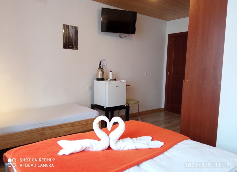 3 osobowy pokój z łazienką wygodny dla pary z dzieckiem lub osoby towarzyszącej . Na powierzchni 17 m2 znajduje się łóżko podwójne ( małżeńskie ) oraz łóżko pojedyncze , szafa, stolik i szafka nocna . Wyposażenie pokoju ; płaski telewizor ,mała lodówka ,czajnik do gotowania wody , filiżanki talerzyki do herbaty lub kawy, .W łazience znajduje się prysznic ,umywalka, wc ,suszarka do włosów, ręczniki , mydło .