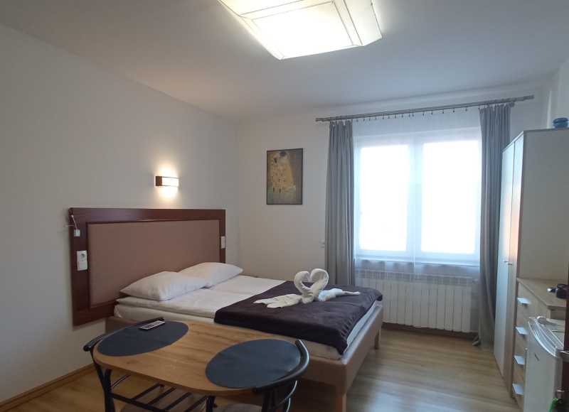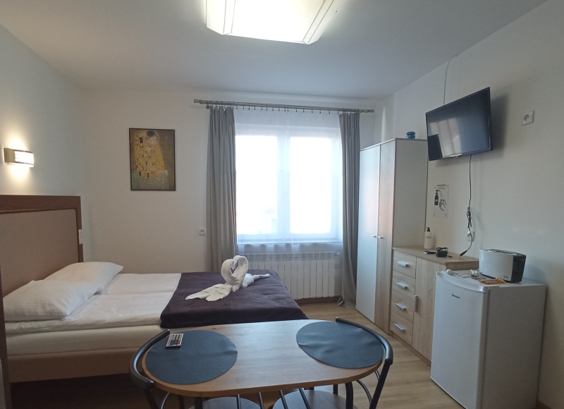 2 osobowy pokój typu studio z łazienką i aneksem kuchennym wygodny dla pary . Na powierzchni 22 m2 znajdują się łóżko małżeńskie oraz szafa, komoda, stolik z dwoma krzesłami i szafka nocna . Wyposażenie pokoju ; aneks kuchenny,płyta grzewcza ,garnki ,talerze ,sztućce , lodówka ,czajnik do gotowania wody , ekspres do kawy ,toster, mikrofala , filiżanki talerzyki do herbaty lub kawy. W pokoju jest stół z 2 krzesłami oraz płaski telewizor. W łazience znajduje się prysznic ,umywalka, wc ,suszarka do włosów, ręczniki , mydło .